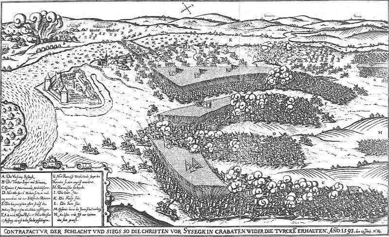 In 1590, the Ottoman sultan Murat III made peace with Persia and turned to war in Europe. In 1593, the Bosnian Hasan pasha Predojević with about 12,000 soldiers (mostly spahis) began to invade Croatian lands, ravaging everything he could. He surrounded Bihać, which was the most advanced point of the defense. Although the defenders begged for help, the city soon fell. Predojević then turned towards Sisak and occupied some smaller fortifications along the way. On June 15, 1593. the Turks came to Sisak where they set up a large camp and started to think about a strategy of an attack. Already after the fall of Bihać, the Croatian Sabor (parliament) passed an insurrection (insurrectio), a decision on a general uprising, where it was written that at the ban’s invitation nobles, serfs, citizens and all clergymen must go to war. If Sisak fell to the Ottomans, the road to Zagreb would be open, as well as to the Habsburg hereditary estates of Carniola, Styria and Carinthia (modern Slovenia and southern Austria). The Christian army that gathered numbered about 6,000 people (mostly Croats and some from the Slovenian and Austrian provinces), and was composed mostly of professional soldiers. There were about 1,000 cavalry (heavy and light cavalry), 4,000 well-equipped and trained armored infantry, and about 1,000 arquebusiers and archers. The army was commanded by Croatian ban (king’s viceroy) Toma Bakač Erdody as the leader of the Croatian part of the army, duke Ruprecht Eggenberg who commanded the Austrian units and Andrija Auersperg as the leader of the Slovenian ones.